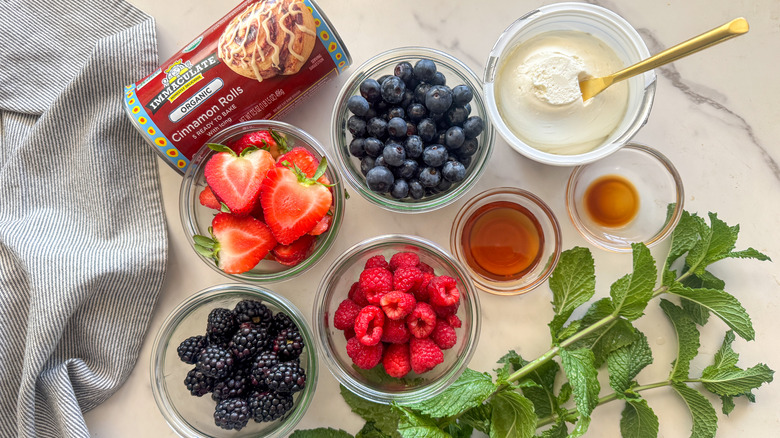 To make this recipe, you don't need to worry about making your own cinnamon roll dough — a simple can from the store will do the trick. Then head to the produce aisle and pick up blueberries, blackberries, raspberries, strawberries, and fresh mint. You'll want to buy the fruit as close to the day you'll be serving the fruit pizza as possible so as to retain optimal freshness. Stop by the dairy aisle and add whipped cream cheese to your cart. Then finish off your store visit with some maple syrup and vanilla.
