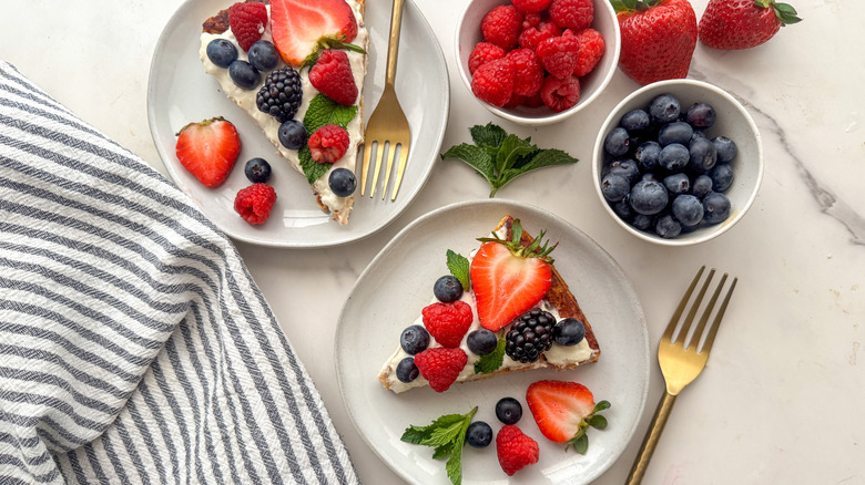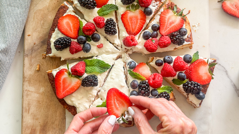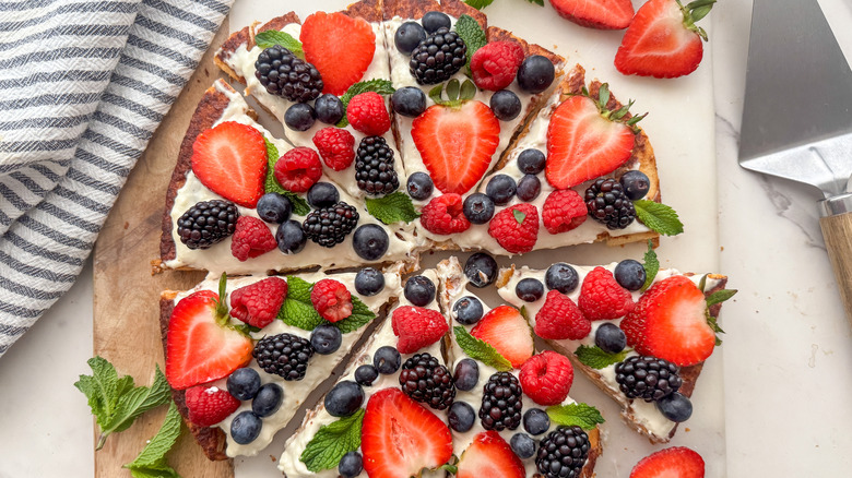 - Distribute blueberries, blackberries, raspberries, sliced strawberries, and mint evenly onto each pizza slice. Serve right away.