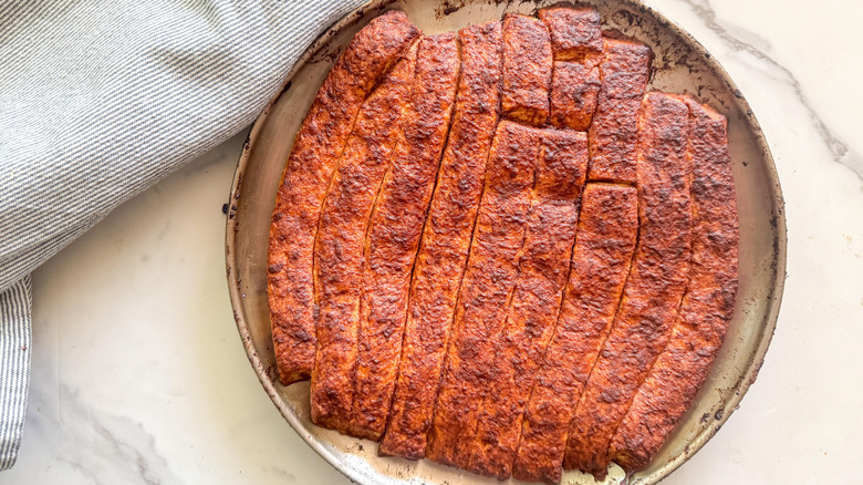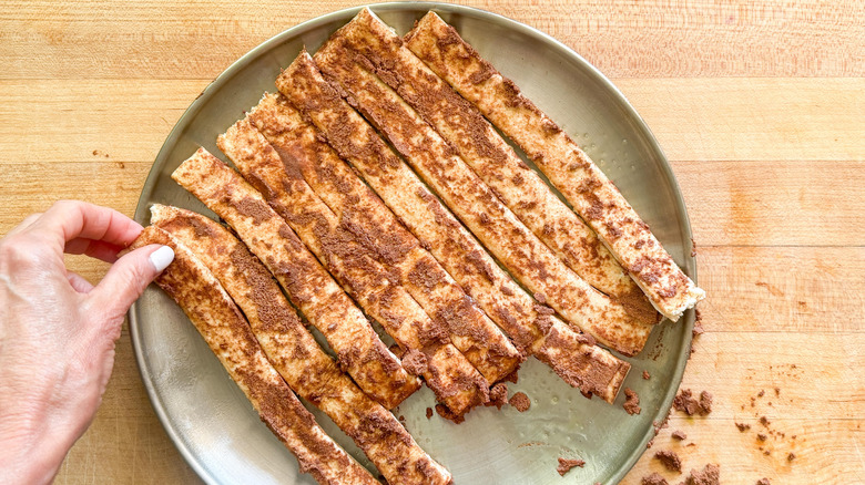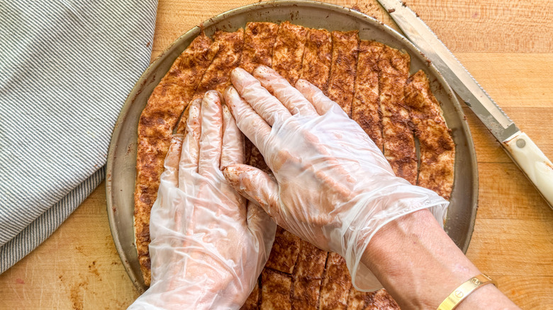 - Unroll the cinnamon roll dough and cover the pizza pan with the cinnamon roll strips, making sure to lay the strips cinnamon-side up.