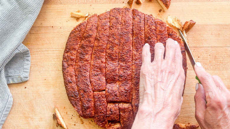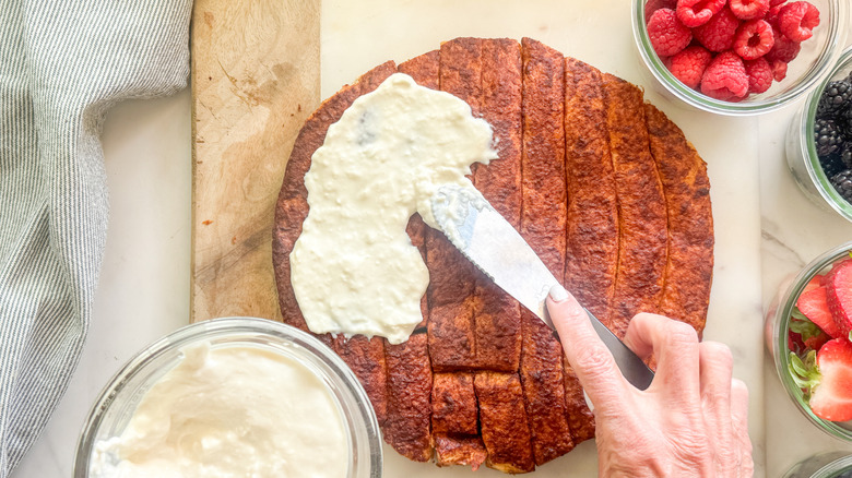 Any fruit pizza is a good pizza — but fruit pizza with a cinnamon roll crust? Now that's a show-stopping brunch entree. This recipe for breakfast fruit pizza, brought to us by developer Miriam Hahn, uses a simple can of cinnamon rolls that is pressed into a pizza pan, then baked until it becomes a pillowy base that's warm and soft with cinnamon sweetness in every bite. The next layer is a creamy maple vanilla cream cheese spread that melts into the crust adding just right texture, and the fresh berry topping with a touch of mint completes the stunning creation. You can use even mix up the fruit based on what is in season, though berries make for a timeless and crowd-pleasing addition.
