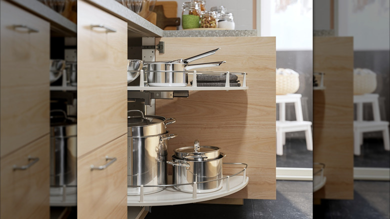 For your drawers, look to basic items like cutlery holders and dividers to make some sense out of all your cooking equipment. Pot lid organizers or pegboards to sort plates are a lifesaver if you're regularly rummaging through your drawers. Cooking board partitions, plate holders, and boxes add plenty of space to store your items. Meanwhile, you could install a pull out pantry to maximize the space in tall cabinets, or a corner base cabinet carousel to make use of those hard-to-reach spots. Finally, sort your trash and recycling with bins that fit into a deep pull-out drawer to keep everything out of sight.