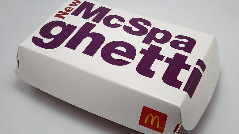 Slurping pasta in the car sounds like a colossal mess just waiting to happen. Perhaps that's why McSpaghetti didn't last very long at the Golden Arches. The Italian-inspired dish of long noodle pasta and marinara sauce with optional meatballs and shredded cheese was introduced in the 1970s. Sold in a box similar to what chicken nuggets come in today, but flatter, the meal may have seemed like a good idea at first, given spaghetti's vast popularity. But because of its long prep time and inability to fit into the fast food model, it was met with more annoyance than intrigue.