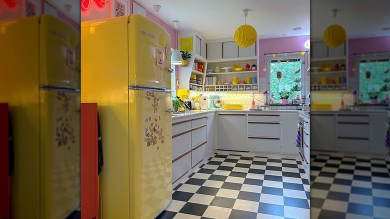 Think hot pink bread bins, lime green canisters, bright green cabinets, and bar stools in electric blue — often showcased against black and white to create a high level of contrast in the kitchen. The use of these unapologetically bold colors was a deliberate choice to inject energy and personality into the heart of the home. You'd find flashy neon signs, striking upholstery, bright appliances, or loud artwork in American kitchens throughout the decade. Today, you can add a nostalgic '80s touch to your kitchen by introducing small doses of neon through retro-inspired accessories like a funky backsplash or with a neon pink stand mixer like this one from Amazon.