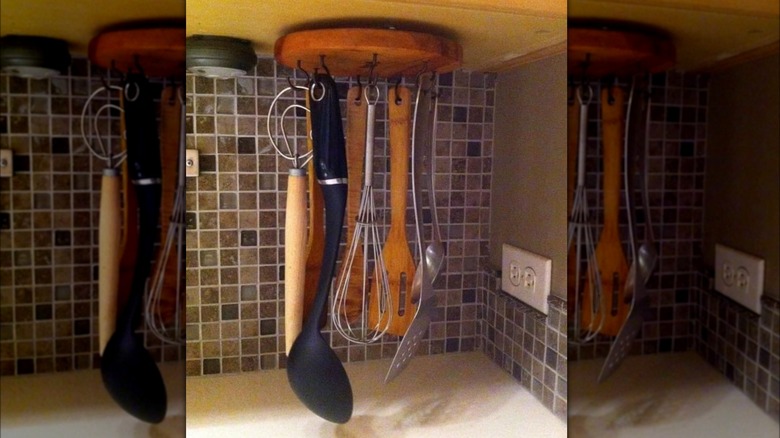 Invert your Lazy Susan and attach hooks to hang cooking utensils