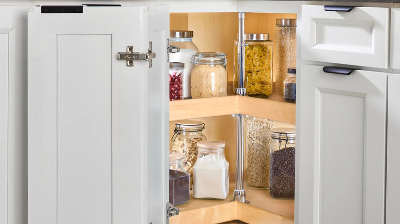 Whichever one you go for, get one with a rim to help keep your items from falling out when you either turn the Lazy Susan or open the cabinet door. This helps to prevent spills and messes if you have food items in your corner cupboard. This setup can be a money and health-saver, too — those deep, dark nooks and crannies of the corner cupboard often become the final resting place for lesser-used items, like sprinkles for your daughter's birthday cake, or that corn flour that you used once to thicken gravy. These items either go stale or they become magnets for kitchen-loving bugs like cockroaches or ants.
