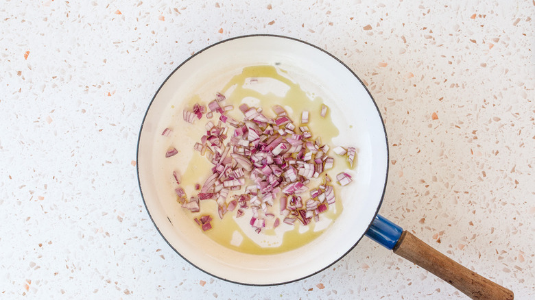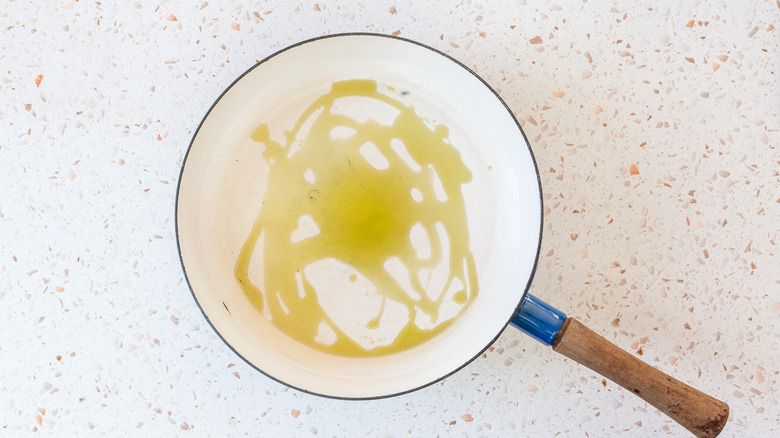 - In a separate pan, preheat the remaining oil on low-medium heat.