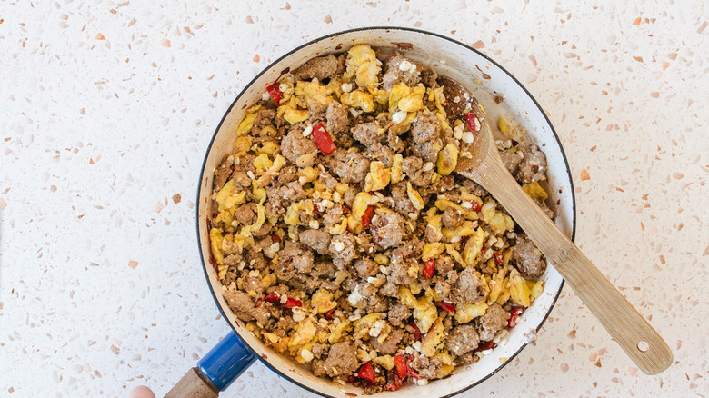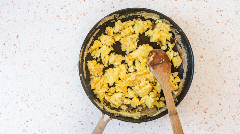 To boost the protein while reducing the carb count, replace the flour tortillas with egg white wraps, cauliflower crepes, or large leaves like collard greens. Increase the protein content by doubling the ground turkey to 2 pounds and adding an extra 4 egg whites to the recipe. You can also add in more protein-rich ingredients such as chopped bacon, diced chicken breast, or a quarter cup of hemp seeds. If you don't love cottage cheese, you can replace it with high-protein Greek yogurt, though it has less protein and a tangier flavor. Finally, you can add a scoop of unflavored protein powder to the egg mixture before scrambling.