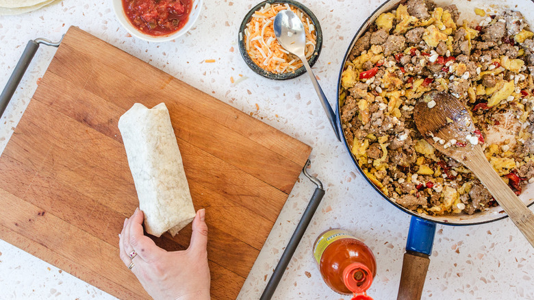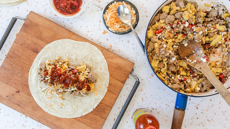 - To assemble the burritos, spread the egg-turkey mixture in the center of the tortilla and top with the cheddar, salsa, and hot sauce.