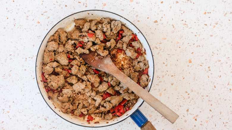 - Add the ground turkey, chili powder, and cumin, and cook until the turkey is browned and cooked through, approximately 7 minutes.