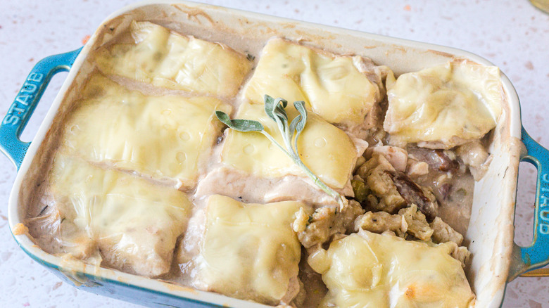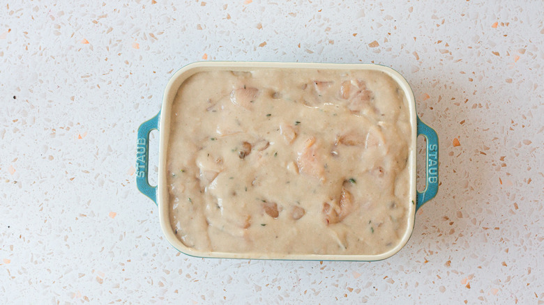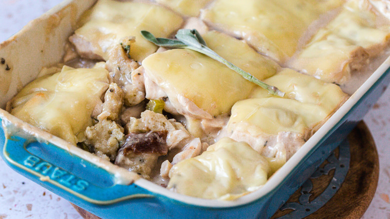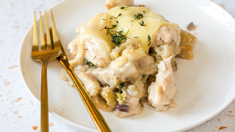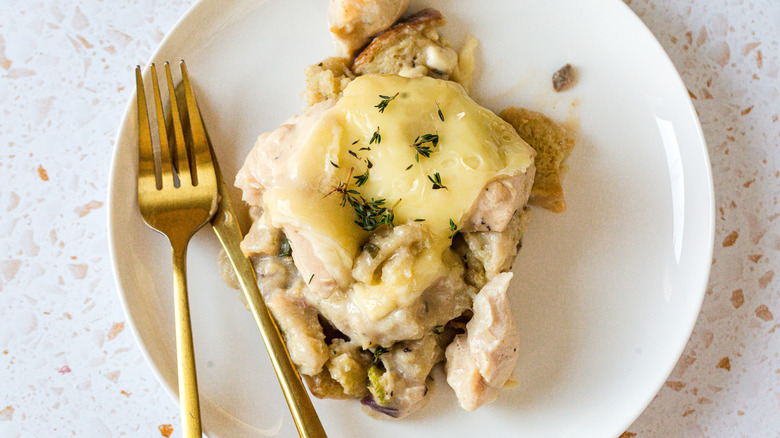 The classic Swiss chicken casserole takes four basic components — chicken breasts, cream of mushroom soup, Swiss cheese, and stuffing — and turns them into a filling meal that's pure comfort. We've made a few tweaks to elevate this easy dish, including using fresh herbs, seasonings, and some other high-quality ingredients. The resulting Swiss chicken casserole recipe preserves the comforting spirit of the original, but makes it feel decidedly elegant.