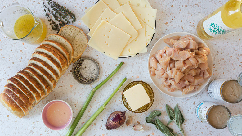 For this chicken casserole, you'll need both pantry staples and some fresh ingredients to make a classic feel slightly more elevated. Start with unsalted butter, purple onion, celery stalks, and garlic cloves as your base. To make the homemade stuffing, grab day-old sourdough bread, fresh sage and thyme, chicken stock, and salt and white pepper. For the chicken layer, we're going old school with boneless chicken breasts, cream of mushroom soup, dry white wine, lemon juice, salt and pepper, thinly sliced Swiss cheese, and a touch of fresh thyme to make it feel fancy.