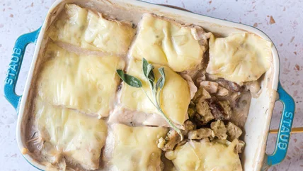 Our elevated Swiss chicken casserole recipe preserves the comfort of the classic version, but makes it more elegant with homemade stuffing and fresh herbs.
