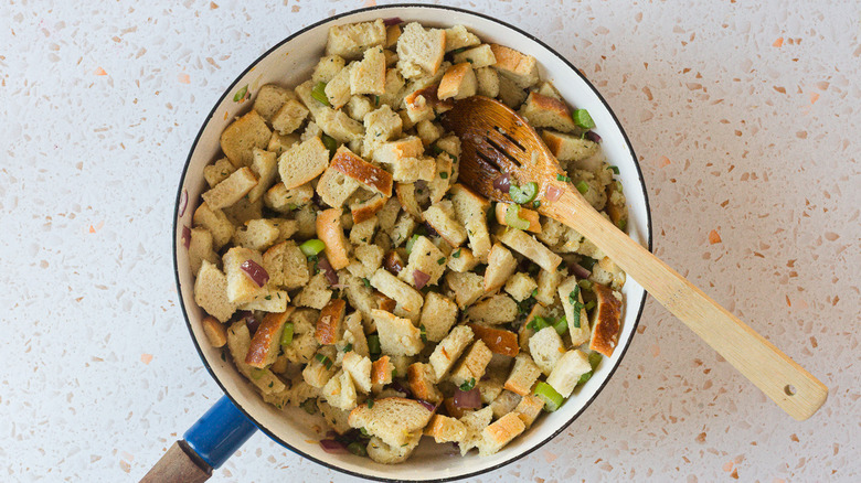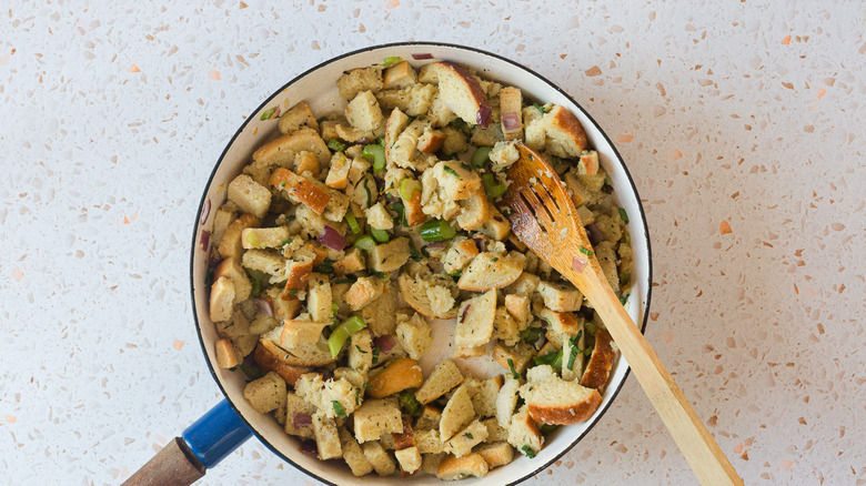 - Add the bread cubes, sage, thyme, and chicken stock.