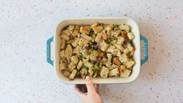 We've taken the classic recipe, which relies on canned soup and likely came from the back of said soup can — we couldn't find any records of its "invention" — and added some fresh components to make the whole thing feel fancy enough to serve to friends. It could even make for an easy side dish for Thanksgiving with its use of stuffing.