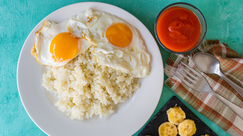 Fried eggs (as well as those cooked in other ways) were an easy protein source that was already a standard part of Cuban meals in the late 1800s. According to Madelaine Vázquez Gálvez and Imogene Tondre, authors of "Cuba the Cookbook," "The food culture in Cuba places a lot of emphasis on animal protein and when meat is not available, eggs are the next best thing" (via Phaidon). Meanwhile, white rice is a fundamental part of many local diets.