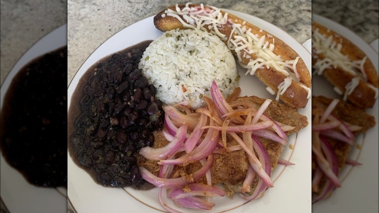 When pork is a regular on the menu, it goes without saying that it comes in a wide range of preparations. Bistec de cerdo encebollado is the Cuban take on pork tenderloin steaks, and it's well worth your time. To start, the meat is usually seasoned with a classic combination of garlic, cumin, oregano, salt, and pepper, or a variation of a mojo marinade with citrus juice, garlic, and fresh herbs. The meat is seared in a hot frying pan to make a golden crust exterior, then further cooked with the marinade to seal in the flavors.