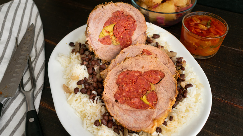 Cuban pot roast, aka boliche, consists of an impressive preparation that is guaranteed to dazzle diners. The recipe consists of an eye of round that's stuffed with ingredients like chorizo (or other types of cured pork), potatoes, and vegetables. The dish highlights the various influences in Cuban cuisine, including those of Spanish and African origin. To prepare, the cured meat is stuffed into the center of the beef, then tied together, and marinated with onions and plenty of mojo sauce to ensure a juicy and tender result.