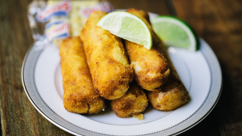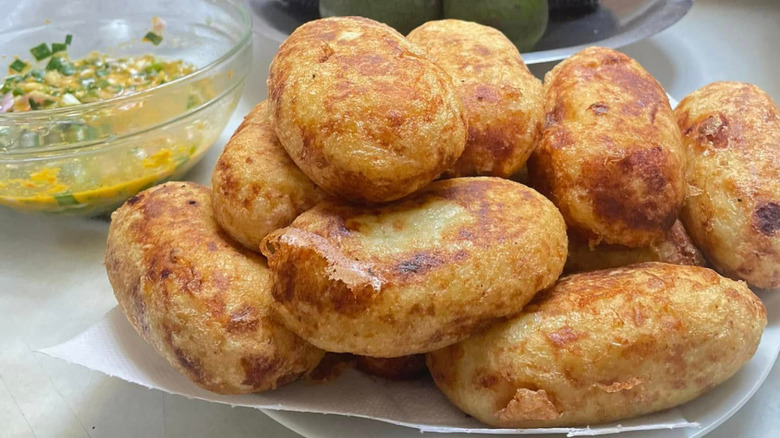 As with so many Latin American dishes, papas rellenas are a blend of numerous recipes with distinct origins. Most sources agree the stuffed potatoes come from Peru, though each country has taken on the dish and given it a unique twist. If you're thinking of a loaded baked potato, that isn't quite what you should expect. Instead, papas rellenas consist of a mass of mashed potatoes rolled into a ball around the filling. The stuffed potato spheres are rolled in breadcrumbs and fried for a crispy shell, similar to a croquette.