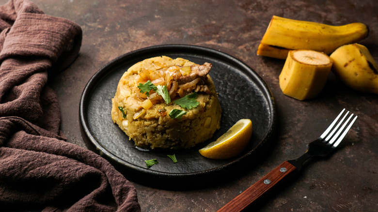 If you've never quite figured out what to do with plantains, fufu de platano is a delicious option. Commonly served as a side dish, fufu has a presence in various Caribbean and Latin American countries. In Cuba, the recipe is usually made with green plantains, which are less sweet and more firm than the riper fruit. To prepare fufu, the peel is removed, and the fruit is cooked in boiling water before being mashed and seasoned. Typical flavors like garlic and salt are incorporated, as well as lime, olive oil or butter, and chicken stock to create a richer consistency.