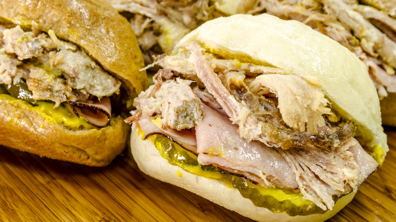 A few elements set the sandwich apart from just any meat and bread combination. Food Fun Travel notes that, first and foremost, you'll need Cuban bread. The wheat bread is made with yeast and a bit of lard, producing a crispy exterior and a light interior. More importantly, a palmetto leaf (aka cabbage leaf) is wrapped around the dough as it rises, providing extra flavor. As for the fillings, the cities of Tampa and Miami engage in a salami debate (the addition is preferred in Tampa but eschewed in Miami), but we'll stick to the basics: smoked ham, roast marinated pork, Swiss cheese, mustard, and, specifically, three pickles. The sandwich can be served as is or pressed between two hot griddles like a panini.