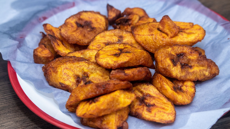 The starchy fruit must be cooked, and the dish takes advantage of the extra sugars that build up as the fruit ripens. Oil, butter, and salt are just about all that goes into the preparation. Although they can be served as a side for just about any rice and meat dish, the fried plantains make a great snack with a bit of lime juice and avocado. For a crunchier take, plantains can be flattened into discs and deep-fried as tostones, not unlike a cross between a chip and a french fry in texture. If you're not in the cooking mood, you can also grab yourself a bag of tostones from Goya.
