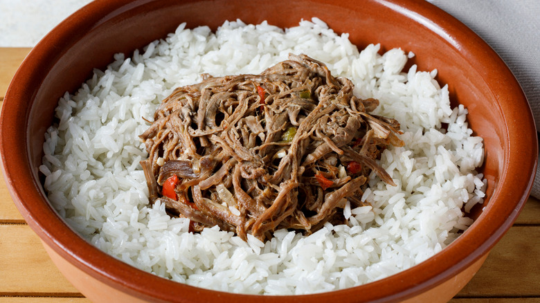 Vaca frita is a direct description of what you'll be served: fried beef. It's not deep-fried but instead, it is first boiled until the meat softens. Then, the beef is shredded, marinated in garlic, lime juice, and salt, and finally pan-fried until it is pleasantly crispy. The source adds that flank or skirt steak are common cuts used for the preparation since they are lean and dry out fairly quickly. Generally, bell peppers, onions, and additional seasonings are fried with the meat to add more flavor.