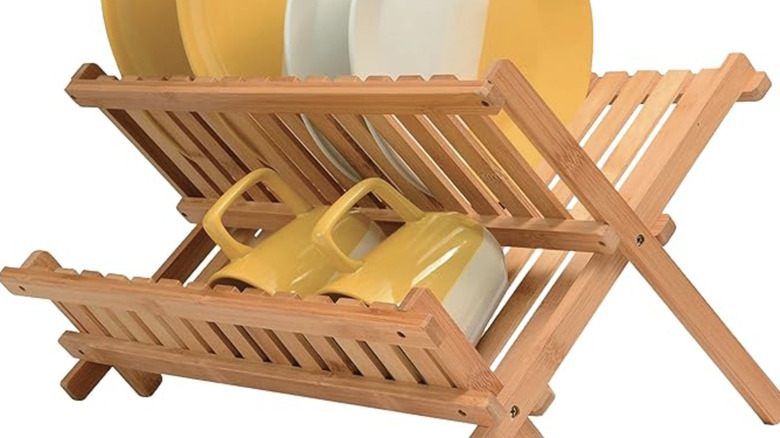 There's a reason why dish racks are also called dish "drying" racks: It's typically where washed dishes rest for open-air draining and drying. But once you've retired that trusty dish-washing companion, it still retains the same capacity — just not in the way you might imagine. The crooks, slats, and crevices are well-ventilated and spacious, making that old dish rack very useful for drying wet kitchen towels; just drape them over the rack to dry naturally for later use or to prevent bacteria buildup before laundry day.