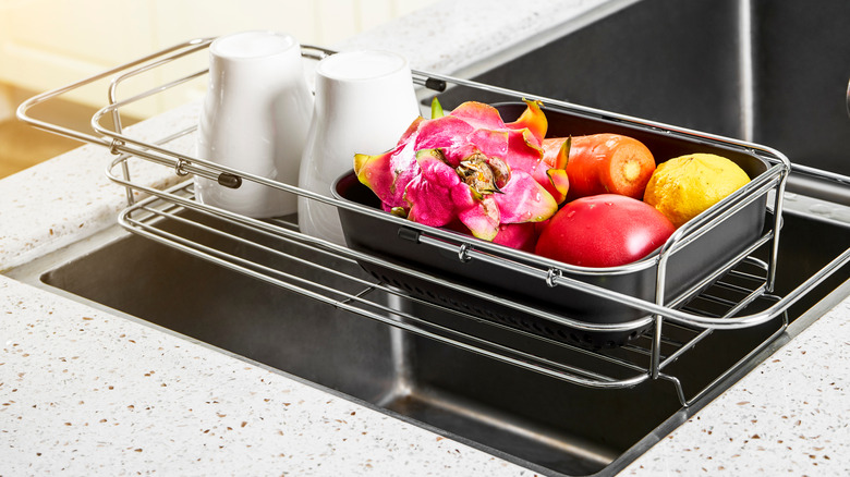 If you're forever washing fruits and vegetables, you now have the perfect drying station for that. Set the dish rack near your sink, and place the washed produce in the slots or on the rack surface, allowing air circulation and reducing the chance of moisture build-up. Remember that moist environments lead to bacterial growth in produce, which in turn facilitates decay and spoilage. Once dried, store fruits, veggies, and fresh herbs as usual.
