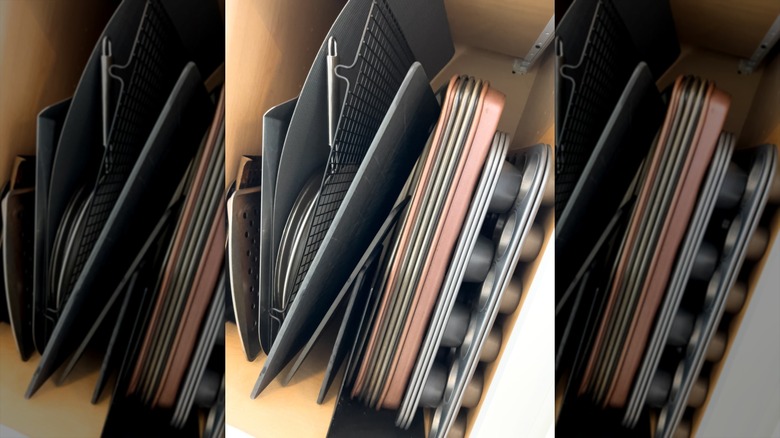 Lids aren't the only things suitable for dish-rack storage: How about those variously sized flat cutting boards used almost every time you cook or prep meals? Like pot lids, they easily slide into the rack slots of many dish-rack styles and configurations. The same goes for flat baking sheets, serving trays, and platters. You'll be either saving cabinet space or better organizing it, while making the items visible and reachable on busy baking or entertaining days.
