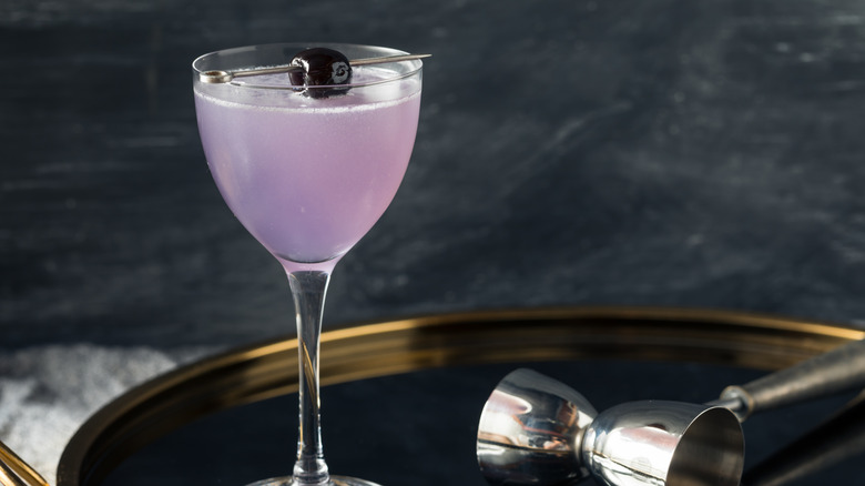 The Aviation is a lavender-toned, cherry-violet French 75 spinoff sure to please guests craving a sophisticated atmosphere. This retro refuge fits all the same-vibe occasions at which you'd want to serve a French 75, but requires a little extra hands-on mixology skills — an opportunity to flex when hosting dinner parties. To assemble, Aviations get shaken over ice, strained into a coupe or Nick and Nora glass, then garnished with a brandied cherry skewer balanced across the rim.