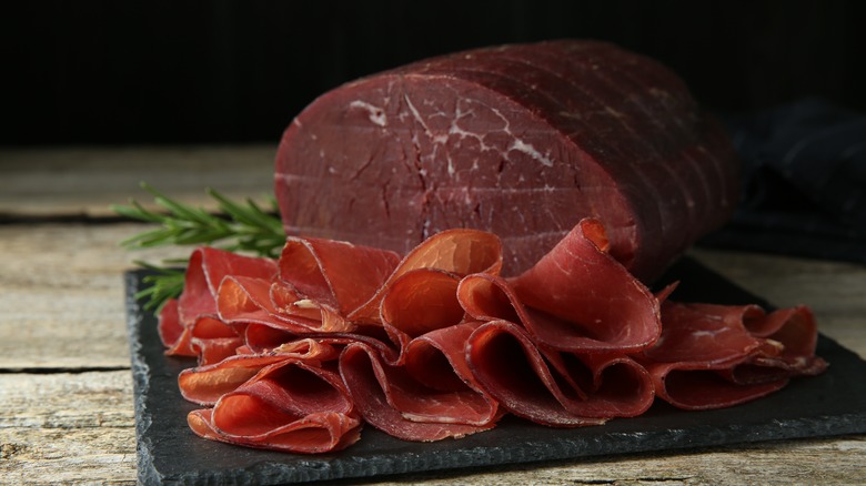 The chewy, thinly-sliced layers of prosciutto are absolutely mouthwatering, making it a beloved deli pick for many. However, Wallace recommends a similar Italian deli meat that's just as flavorful. "Bresaola is made from the topside of beef," she explains. "Made in a similar way [to] prosciutto, this lean cut of cured beef is full of flavor and will level up your deli selections." Cured meat is typically made from pork, but bresaola's main ingredient is what makes it such a catch. It's made from the lean eye of the round beef cut and air-dried, which gives the deli meat its delicate texture.