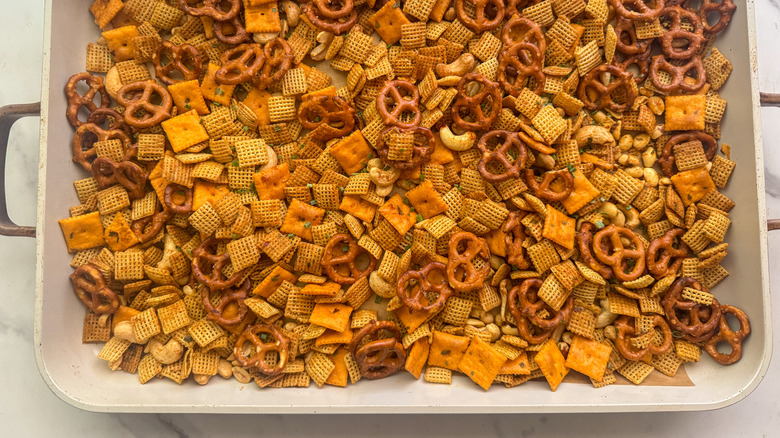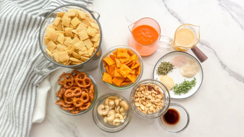 There are many ways to add a twist to the Buffalo snack mix should you feel the need to switch it up. Starting with the Buffalo sauce, try swapping it out for BBQ sauce or hot honey for smoky-sweet versions. To add some heat, add a pinch or more of cayenne pepper or red pepper flakes. There are, of course, other crunch options to add as well. Popcorn, crispy chickpeas, mini breadsticks, bagel chips, or wasabi peas all add an interesting element to the snack mix.