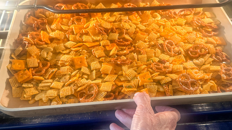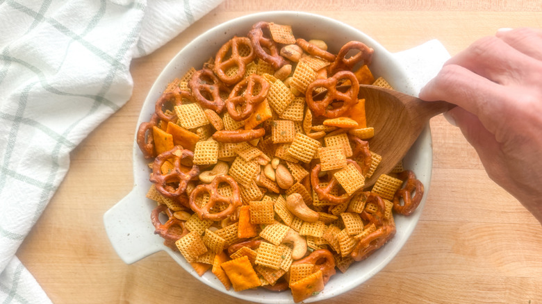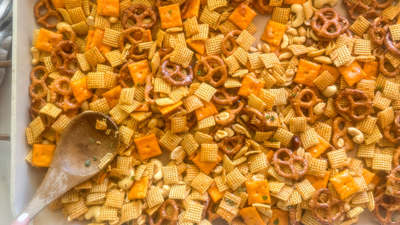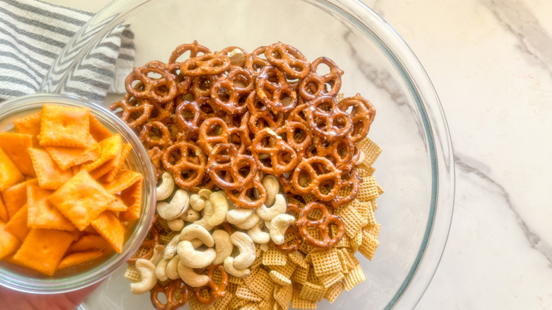 Step 3: Combine the Chex cereal, pretzels, crackers, and nuts