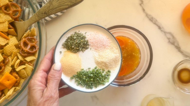 When bottled up, this snack mix also makes for an attractive hostess gift, and we'll touch more on ways you can transform this mix into the perfect little gift down the line. "The nice thing about this snack mix is how simple it is to make, and how perfect it is for any occasion," Hahn says, adding, "I love to see people's reaction when they take a bite expecting it to be run of the mill and they taste the bold crunch."