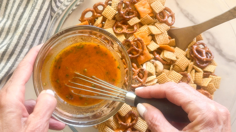 Step 5: Toss dry snack mix with Buffalo sauce mixture