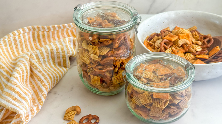 Snack mix is an ideal thing to make ahead and use for different uses. To store it properly, let it fully cool for about 30 minutes, then transfer it to an airtight container or resealable bag. You'll want to store this at room temperature in a cool and dry place, and it will last for up to 2 weeks. If you live in a particularly humid climate, you can add a small square of paper towel or parchment paper to absorb extra moisture. Resist the temptation to refrigerate the snack mix as it can get soggy from the condensation.
