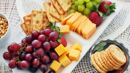 If you like your breakfast on the sweeter side, build your snack plate around a yogurt parfait. Putting Greek yogurt into a salad dressing cup allows you to dip all kinds of fruits and crackers into the creamy product. Add a mix of strawberries, blackberries, and blueberries to the snack plate, along with chocolate-covered almonds. Finish it off with pieces of brie, pretzels, and granola clusters for a delicious crunch.
