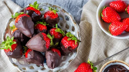 White and dark chocolate taste incredible together on strawberries, while blueberries are delicious with a combination of dark and milk chocolate. Either way you do it, make sure the first layer hardens completely before dipping the fruit the second time around. This technique can be used to combine the fruit with other flavors, too, like with these chocolate strawberry bites that deliver a hit of creaminess thanks to yogurt.