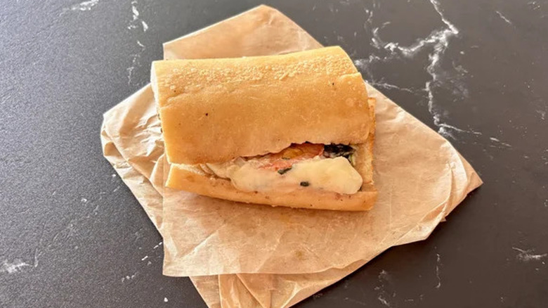 Along with taste, overall satisfaction, sauces, and garnishes, a crucial factor for our ranking was filling-to-bread ratio. And the proportions of the toasted garden caprese sandwich were all wrong. We get that Panera is first and foremost a bakery, but a sandwich isn't all about the bread. We'd be generous in saying that the bread-to-filling ratio was 90 to 10, with the toasted ciabatta this bread came on completely overwhelming the whole sandwich.