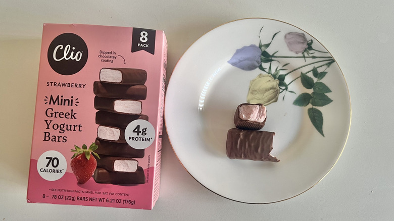 The bars are supposed to be refrigerated, providing a cooling component in every bite. After the first taste, you'll notice a mild tangy base because of the Greek yogurt and then a fruity profile from the dried strawberry powder. There's the crisp snap of the thin chocolate outside, and everything comes together to make a scrumptious treat with 4 grams of protein. See if you can find the Clio chocolate-coated strawberry Greek yogurt mini bars located near you when you have a hankering for something strawberry cheesecake-esque.