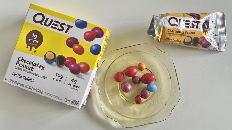 Curb your candy craving with Quest's Chocolatey Peanut Coated Candyies. These are a terrific alternative to the classic peanut M&Ms — an iconic option, but sometimes you don't want to ingest nearly half your daily recommended sugar in a small 1.74-ounce baggie. The Quest version has all the elements that you expect: the crisp crack as you bite into the exterior candy coating, the melt-in-your-mouth chocolate middle, and the light crunch of the peanuts.