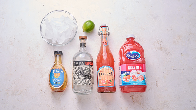 Like a regular paloma, you'll need a high-quality tequila, agave, grapefruit juice, and lime juice. Freshly-squeezed juices are best here, but for harder-to-squeeze (and sometimes bitter) fruits like grapefruit, bottled juice does the job. Look for the ruby red grapefruit variety; this type is one of the sweetest and a little less tart than other kinds. You'll also need a good bit of ice to properly thicken the drink into a slushy texture. The finishing touch is sparkling grapefruit soda to top off the drink and give it a thirst-quenching fizz.