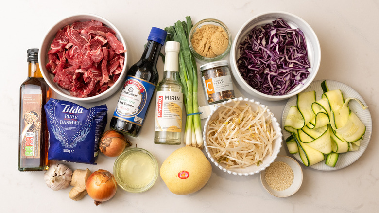 To begin this beef bulgogi rice bowl recipe, first you will need to gather the ingredients. For the marinade you will want fresh ginger, nashi pear (also known as Asian pear), onion, garlic cloves, soy sauce, light brown sugar, mirin, sesame oil, and red chile flakes. For the bowl you will additionally need ribeye steak, jasmine or basmati rice, vegetable oil, an onion, red cabbage, zucchini, bean sprouts, scallions, and sesame seeds.
