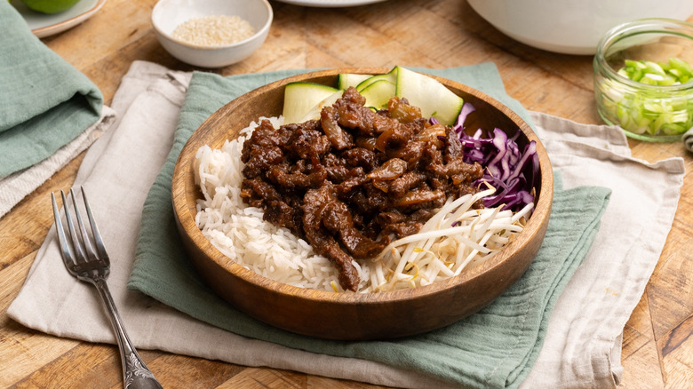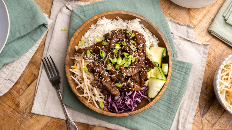 This Korean-inspired rice bowl captures the myriad flavors of marinated beef bulgogi, but manages to come together in under an hour.