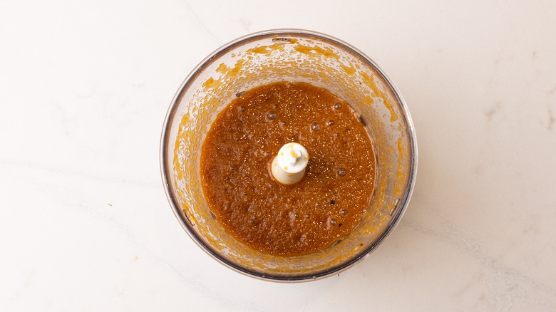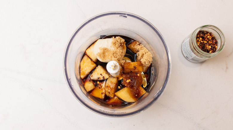 - Add the ginger, nashi pear, onion, garlic, soy sauce, light brown sugar, mirin, sesame oil, and chile flakes to a food processor.