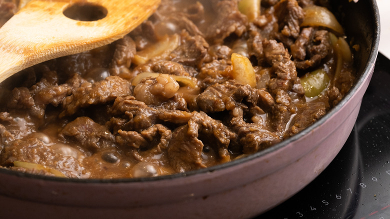 - Cook for 5 minutes until the beef is cooked through and any liquid has evaporated.