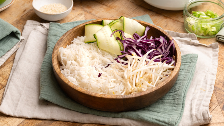 One of the great things about rice bowls is how easily adaptable they are. If you've got any leftover veggies lying around in the fridge, why not throw them into the mix for a healthy lunch or dinner alongside, or in place of, the red cabbage and beansprouts? Shredded carrot, refreshing cucumber, radish, or bok choy all make great alternative options for your rice bowl and will add plenty of color to your plate, as well as a diverse variety of vitamins and minerals.