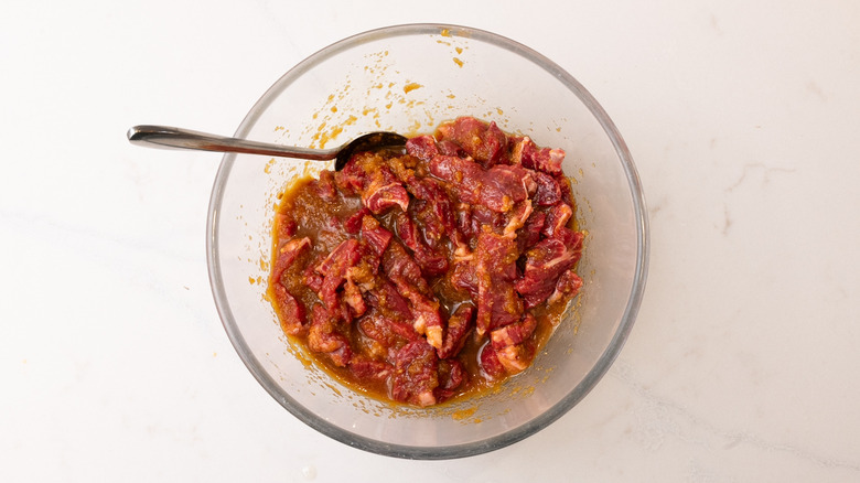 Mix the sliced beef with the marinade and set aside for 25 minutes.