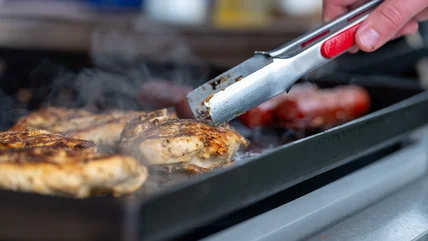 Though you can use flaxseed oil to season a griddle, it has a generally lower smoke point. Watson explains, "When it comes to seasoning, stick with oils that have a high smoke point, such as avocado or grapeseed oil." Carefully spreading the oil using paper towels held by a pair of tongs will help you to safely and evenly coat the surface, including corners and edges. "You want a thin, even coat, not puddles," he added.