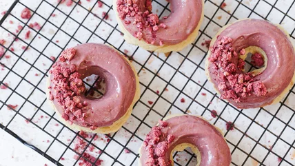 These sweet and fruity keto-friendly raspberry glazed donuts pack a lot of protein and flavor and make a perfect pick-me-up whatever diet you follow.